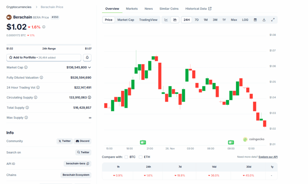 After flying to all-time highs in February 2025, BERA USDT has been dumping hard. To put it in numbers, BERA crypto is down -92% from all-time highs, and on November 22, it plunged to all-time lows.