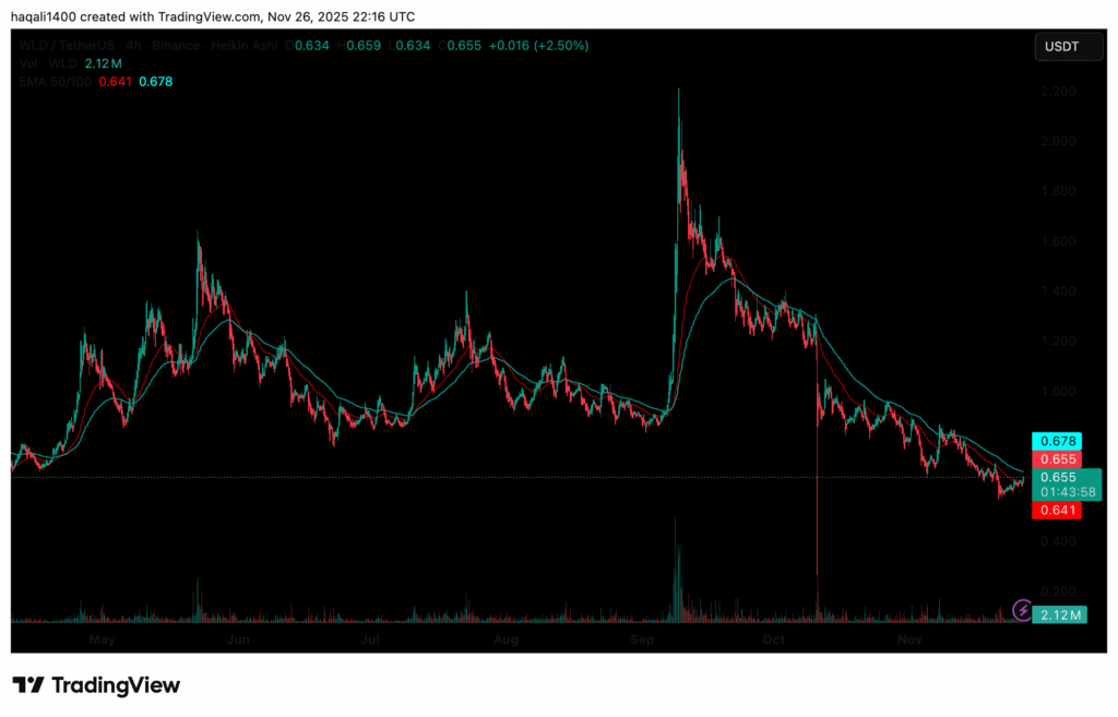 The slide followed a sharp pullback from September, when WLD briefly moved above $2.00 before failing to hold those levels and turning lower.