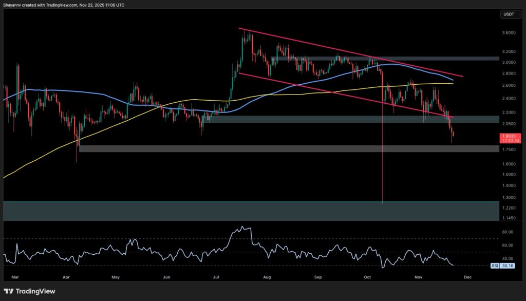 The RSI is also nearing oversold levels, currently around 30, which may suggest a short-term bounce. However, without reclaiming the $2 level, the structure remains bearish. If selling pressure continues, the next downside target lies near the $1.50 range.